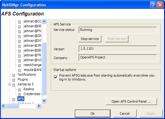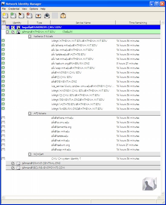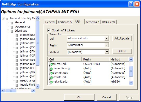 The Network Identity Manager replaces the former KFW 2.6.x ticket manager, "Leash", and when combined with the OpenAFS Provider it can be used as a replacement for the AFS Authentication Tool (afscreds.exe). Unlike both Leash and the AFS Authentication Tool, Network Identity Manager with the OpenAFS Provider can easily acquire and renew AFS tokens for multiple cells from one or more Kerberos v5 identities.